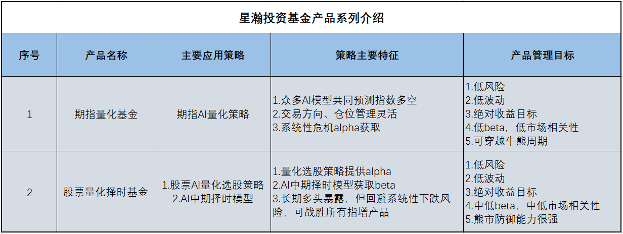 公司核心成员拥有理工科高学历背景和海外留学经历,具备丰富的资管经验和量化对冲基金投资实践。自成立以来,公司不断夯实策略研发和迭代能力,秉承数据、科技引领投资的理念,全面融合人工智能算法模型,致力于打造低风险-绝对收益型量化对冲基金体系,为投资人创造长期价值。此外公司研发的股市AI风控模型,可为股票多头管理机构提供专业风控解决方案。